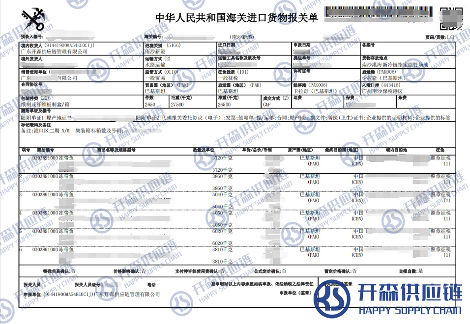 【本文結語】 上述就是巴基斯坦凍帶魚進口報關清關代理服務【經典案例】的全部內容,希望能對您有所幫助,如有水產品進口報關上任何疑問及問題可隨時在線聯系我們或撥打 18002611553,開森供應鏈擁有豐富的水產品進口報關操作經驗及案例,10余年進口經驗為您所用,各類進口疑難都能為您一一解答及協助快速處理解決!