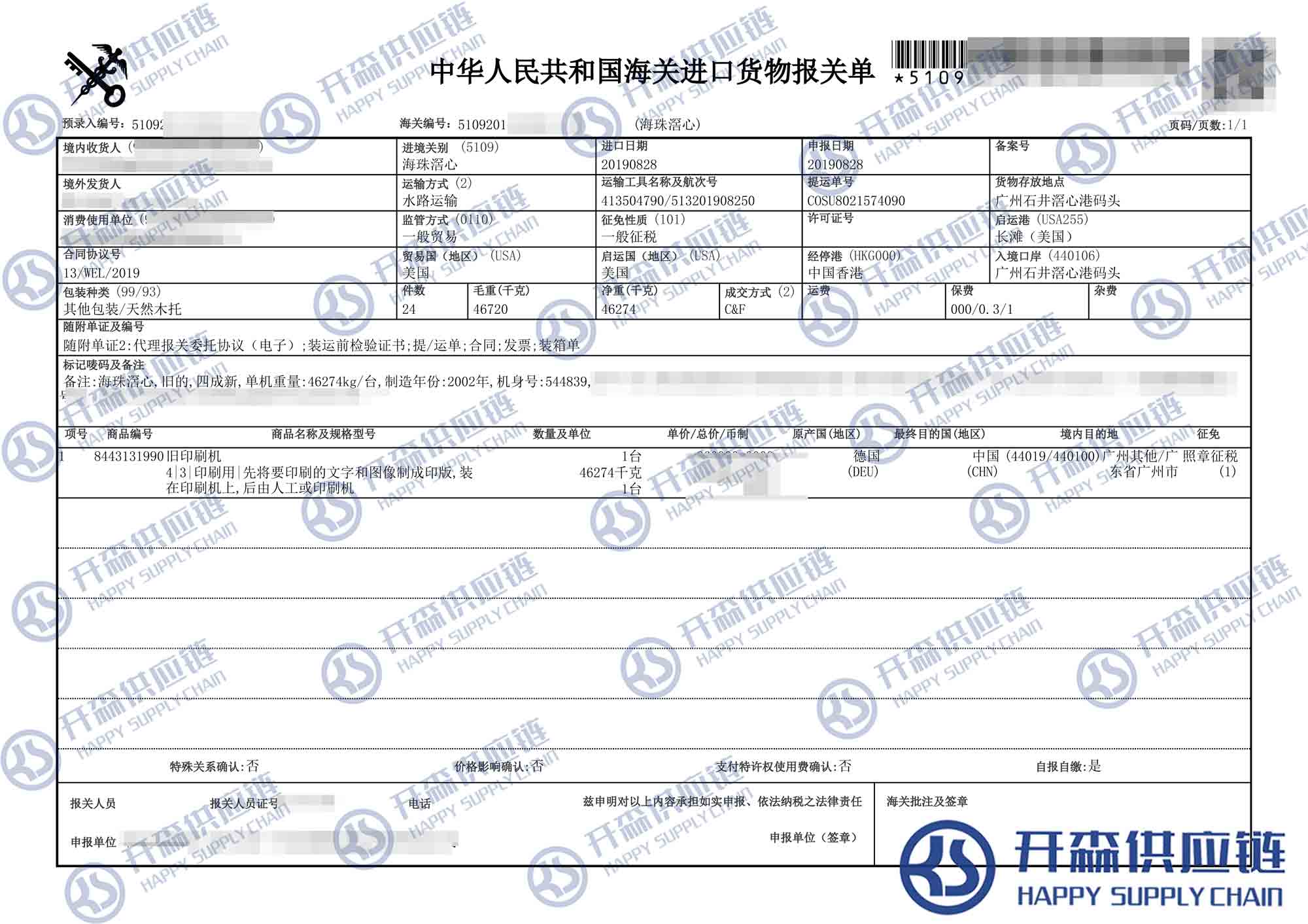 【本文結語】 上述就是【進口案例】廣州港二手印刷機進口報關代理服務的全部內容,希望能對您有所幫助,如有二手印刷機進口報關上任何疑問及問題可隨時在線聯(lián)系我們或撥打 18002611553,開森供應鏈擁有豐富的二手印刷機進口報關操作經驗及案例,10余年進口經驗為您所用,各類進口疑難都能為您一一解答及協(xié)助快速處理解決!