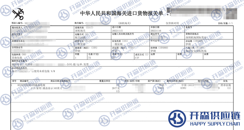 【本文結語】 上述就是深圳機場LED液晶電視進口報關代理服務【經典案例】的全部內容,希望能對您有所幫助,如有深圳進口清關上任何疑問及問題可隨時在線聯系我們或撥打 18002611553,開森供應鏈擁有豐富的深圳進口清關操作經驗及案例,10余年進口經驗為您所用,各類進口疑難都能為您一一解答及協助快速處理解決!