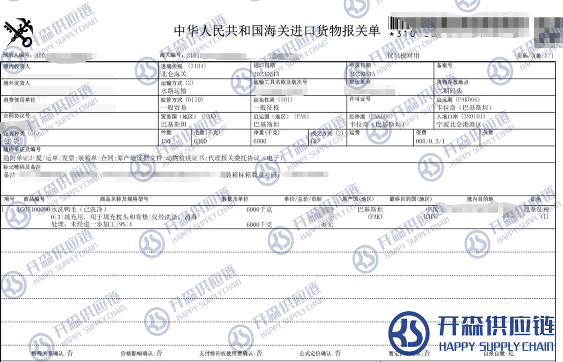 【本文結語】 上述就是寧波港巴基斯坦水洗鴨毛進口報關清關代理服務【經典案例】的全部內容,希望能對您有所幫助,如有水洗鴨毛進口報關上任何疑問及問題可隨時在線聯系我們或撥打 18002611553,開森供應鏈擁有豐富的水洗鴨毛進口報關操作經驗及案例,10余年進口經驗為您所用,各類進口疑難都能為您一一解答及協助快速處理解決!
