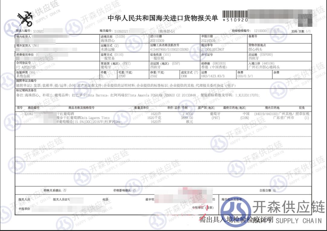 【本文結(jié)語(yǔ)】 上述就是【進(jìn)口案例】葡萄牙葡萄酒進(jìn)口報(bào)關(guān)代理服務(wù)的全部?jī)?nèi)容,希望能對(duì)您有所幫助,如有葡萄酒進(jìn)口報(bào)關(guān)上任何疑問(wèn)及問(wèn)題可隨時(shí)在線(xiàn)聯(lián)系我們或撥打 18002611553,開(kāi)森供應(yīng)鏈擁有豐富的葡萄酒進(jìn)口報(bào)關(guān)操作經(jīng)驗(yàn)及案例,10余年進(jìn)口經(jīng)驗(yàn)為您所用,各類(lèi)進(jìn)口疑難都能為您一一解答及協(xié)助快速處理解決!