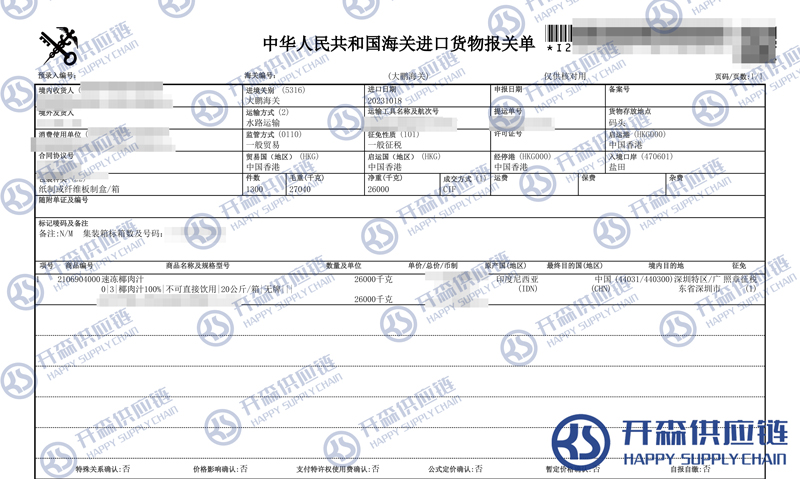一、香港速凍椰肉汁進口報關(guān)代理案例詳情